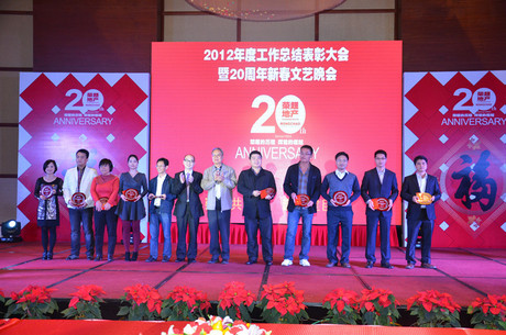 在首先進行的2012年總結(jié)表彰大會上,總經(jīng)理代表董事長總結(jié)了公司2012年取得的工作成績,這年榮超人開拓進取,扎實工作,先后取得了“榮超中心B座”100%租賃、“榮超大廈”全面完工、“榮超英隆大廈”基本完工、 “福華小區(qū)”100%和諧拆遷、“榮超城市春天花園”全面開工等出色成績,為2012年畫下了最精美的句號。同時布局了2013年重點工作,這年榮超開門迎喜,成功拿下南山高新科技園一宗地塊,暫定名“榮超聯(lián)合總部大廈”,這個好開端是榮超20周年最好的生日禮物。會上還對“2012年度優(yōu)秀員工”、“五年、十年長期服務員工”進行了表彰。特別是在頒發(fā)十年長期服務獎時,董事長用他獨特的Style來進行頒獎,將全場氣氛推向了高潮。