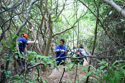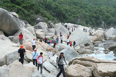 從西貢的叢林山路為起點,大家沿著一條往上的,狹窄高高的陡坡前行,山路崎嶇,高低不平,小路叢林茂密,兩邊枝繁葉茂,略需低著頭,用雙手拔開樹枝,才能奮力前行。大約攀爬30多分鐘,到達半山腰,往下看,樹濤連綿,層巒疊嶂。秀美山色,引來了大家情不自盡的贊嘆聲。翻過山頭,下山的路比上山的路略好走些,但一路的顛簸還是消耗了大家大部分的體力,而這山路僅是這穿越活動的第一步。