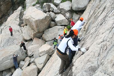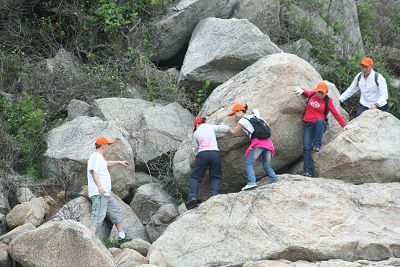 然而,更大的挑戰(zhàn)緊隨而來,在巖石中的穿越才是真正考驗榮超人的時候。在巖石間行走并不是件簡單的事,因為巖石跌宕起伏,上面滲著海水,腳下一不留神,就會有危險。這一路,大家小小翼翼,手挽相助,攜手共進。成功穿越過這一大片巖石之后,又是一座高山聳立在前,每一個人榮超人抱著挑戰(zhàn)自我,戰(zhàn)勝自我的信心,攀爬翻越。同事間的相互鼓勵打氣,成為了穿越過程中美麗的風(fēng)景。