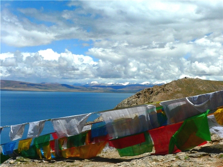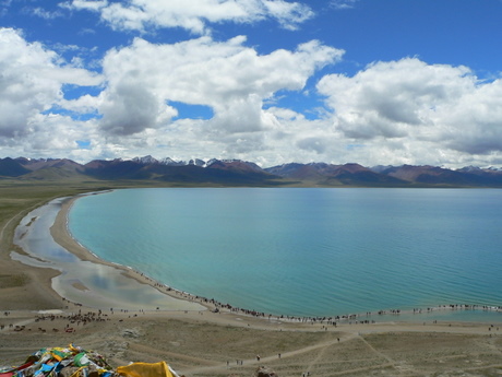 山上掛滿藏人信徒祈福的經(jīng)幡,在藍天白云襯托之下隨風飛舞,五彩繽紛,甚是好看。據(jù)說這經(jīng)幡起源于十二世紀初的藏傳佛教噶舉派寺院,也稱風馬旗,顏色分白、黃、紅、綠、藍五種?!帮L馬”的意思是:“風是傳播、運送印在經(jīng)幡上的經(jīng)文遠行的工具和手段,是傳播運送經(jīng)文的一種無形的馬,馬即是風?!辈孛褡逭J為雪域藏地的崇山峻嶺、大江莽原的守護神是天上的贊神和地上的年神,他們經(jīng)常騎著風馬在雪山、森林、草原、峽谷中巡視,保護雪域部落的安寧祥和,抵御魔怪和邪惡的入侵。這種意識是用經(jīng)幡上印有一匹背馱象征福祿壽財興旺的“諾布末巴”(圓錐形火焰圖案)行走的馬,以及印在經(jīng)幡上的咒語、經(jīng)文或祈愿文的圖像來表達的。不單在這里,我們一路經(jīng)過的藏區(qū)各處,在山間水域,遠遠的都可看見風中飄舞的風馬經(jīng)幡,它已經(jīng)成了藏區(qū)大地蒼穹的靈魂符號。到這時,才想起納木措原本也是藏傳佛教的一處圣地。自十二世紀末,藏傳佛教達隆嘎舉派創(chuàng)始人達隆塘巴扎西貝等高僧,曾到湖上修習密宗要法,并始創(chuàng)羊年環(huán)繞納木靈湖之舉。信徒傳說,每到藏歷羊年,諸佛、菩薩、護法神集會在納木湖設壇大興法會,若信徒此時前往朝拜,轉(zhuǎn)湖念經(jīng)一次,勝過平時朝禮轉(zhuǎn)湖念經(jīng)十萬次,其福無量。所以每到藏歷羊年僧俗信徒不惜長途跋涉,前往轉(zhuǎn)湖。這一活動在四月十五達到高潮。此時我等世俗凡人,三步一喘五步一歇的不速之客,面對神圣湖水,就在靜默中去體驗三百多公里轉(zhuǎn)湖一周的圣舉吧。不求靈魂超越,祈望能求得幾分佛祖散播的福祉。