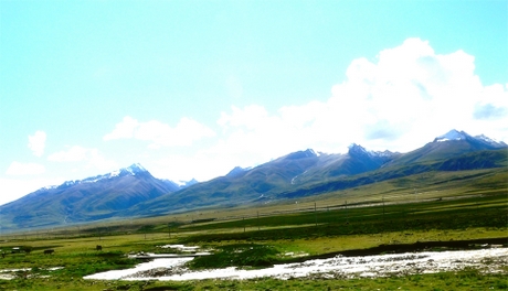 納木措是一處高原湖泊,位于拉薩城西北方向230公里,湖水面積約1920平方千米,海拔4718m,是我國第二大、世界最高的咸水湖,納木措的藏語含義即是“天湖”。這是此次川藏行的最后一處景點,也是最能代表西部高原自然和人文精神的去處。八月二十日早八點,我們一行人驅(qū)車沿青藏公路往當雄縣方向駛?cè)?。因為藏區(qū)公路普遍施行交通管制,車輛嚴格限速,車隊只得徐徐行駛。沿途經(jīng)過遼闊的羌塘草原,草肥水美,牛羊星羅棋布,氈蓬在晨光下五彩輝映,遠處念青唐古拉山脈層巒疊嶂,云間有冰峰若隱若現(xiàn),好一幅藏北高原的美麗風光。據(jù)說此地還是野生動物的天堂,也許是緣分不夠,未得一飽眼福;著名的冬蟲夏草也主要產(chǎn)于這一帶的山坡草地,當然這次我們只能在特產(chǎn)店里見到這個神物了。一路邊看邊行,欣賞拍照,我們于午后到達湖區(qū)。